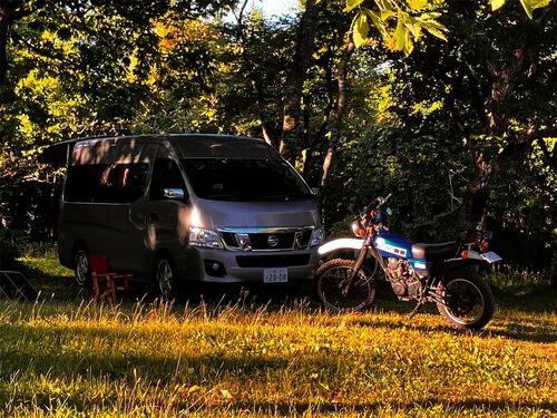 ここはキャンピングカー専用の駐車場が完備してる。 バイク下ろしてベッド設営して快適に過ごせた。昨夜は少し肌寒いほどでした♪ 隣のキャンピングカーのご夫婦に近くの観光地を教えて頂いたのでバイクで走って来たよ。 ナイタイ高原牧場で丘の上につながる…
